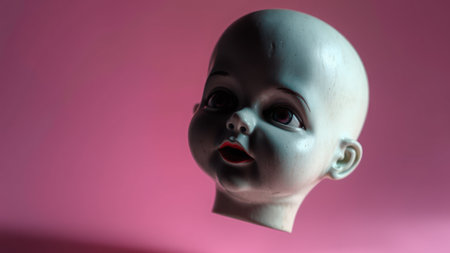 A cracked porcelain doll head with haunting features, floating against a pink background. AI generation