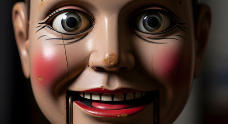 An extreme close-up macro shot of a creepy vintage ventriloquist dummy's face. The doll has wide, staring eyes, a cracked paint finish, and a mechanically open mouth, creating an eerie and unsettling atmosphere suitable for horror themes.