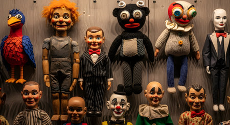 A disturbing collection of vintage puppets and ventriloquist dummies displayed against a wooden background. The assortment includes figures with unsettling expressions, such as clowns, dolls with strange eyes, and other eerie characters, creating a creepy and haunted atmosphere. This image is suitable for horror, thriller, or Halloween themes.