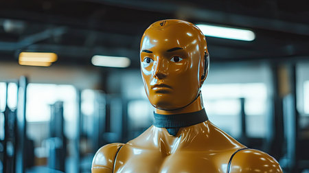 A close-up of a training dummy mannequin in a gym, ready for martial arts practice with punching gloves in the background.