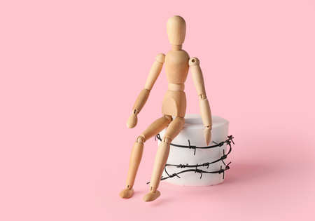 Toilet paper with barbed wire and wooden human figure on color background. Hemorrhoids concept