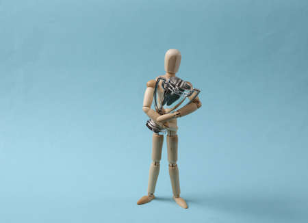 Wooden mannequin in action on a blue background with copy space.
