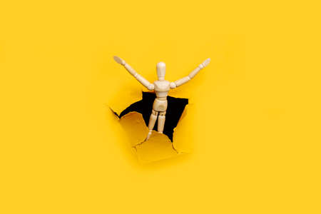 joyful wood man puppet with hands raised up ripped cardboard yellow background.