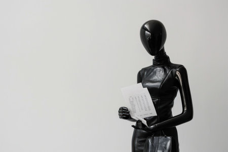 Black mannequin holding blank white paper against clean white background for text or message display