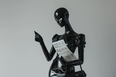 Plastic mannequin holding paper and making eye contact with camera in black and white setting