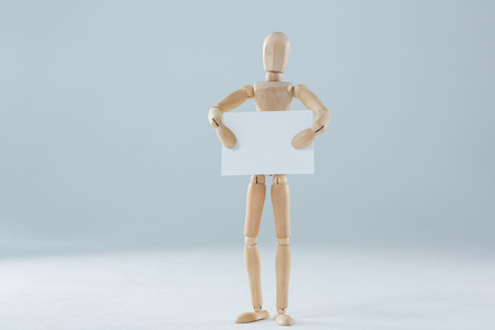 Wooden figurine holding blank placard against white background