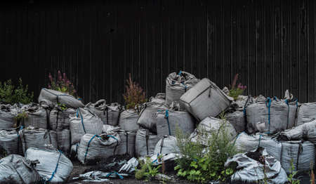 Plastic garbage bags stacked in a row against a brick wall, creating an urban scene