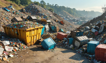 A vast city garbage dump sprawls with towering mountains of waste, a stark reminder of consumption