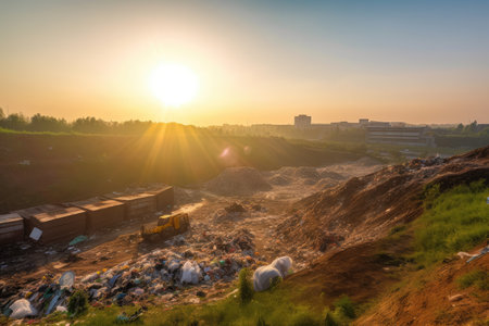 landfill surrounded by greenery, with the sun shining down on the trash, created with generative ai