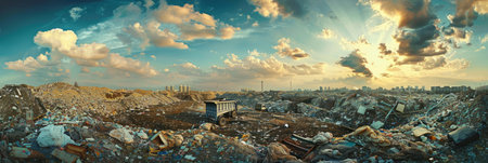 Mountains of garbage dominate a sprawling city dump, showcasing the scale of waste disposal challenges, banner