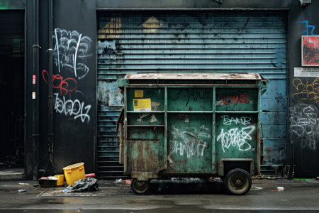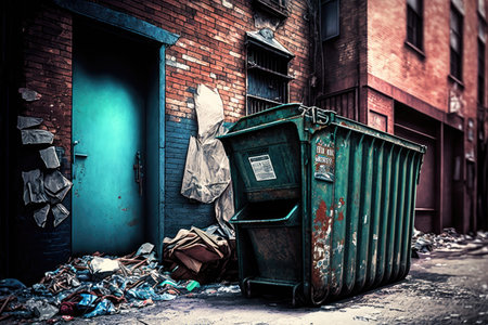metal dumpster in alley with overflowing garbage, created with generative ai