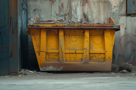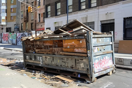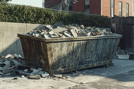 Realistic image of a weathered metal dumpster overflowing with construction debris in urban setting