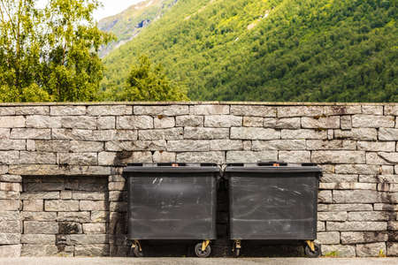 Rubbish recycling concept. Two black industrial trash cay dumpster containers, littler garbage