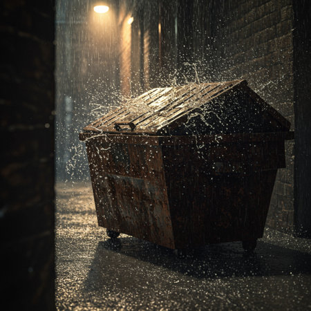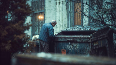 Elderly homeless man searching through garbage dumpster in urban alley during twilight hours with dramatic moody lighting.