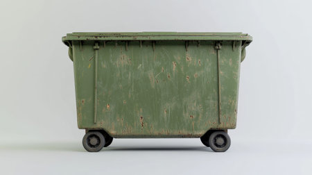 An old green trash bin on wheels showcases a worn rustic texture, ideal for urban and environmental themes. The weathered look enhances its character.
