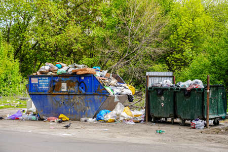 Samara, Russia - May 22, 2022: Containers with garbage and different rubbish at the city street