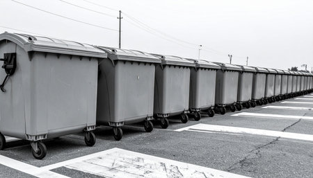 A stark, black and white photograph captures the powerful visual of a seemingly endless row of industrial dumpsters.