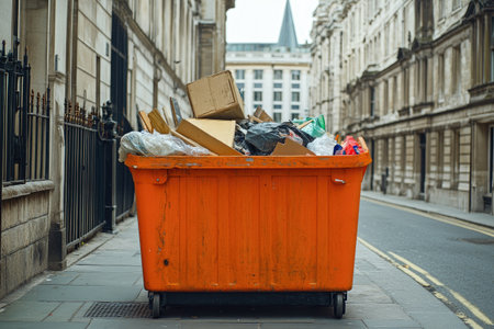 Orange refuse container overflowing with various types of waste, situated on a city street next to buildings. The container is full to the brim with discarded materials, including cardboard boxes, plastic bags, and other items.