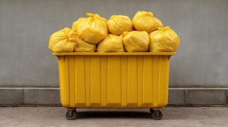 A bright yellow trash bin filled with plastic bags is photographed against a gray wall, illustrating urban waste management challenges and the importance of cleanliness.