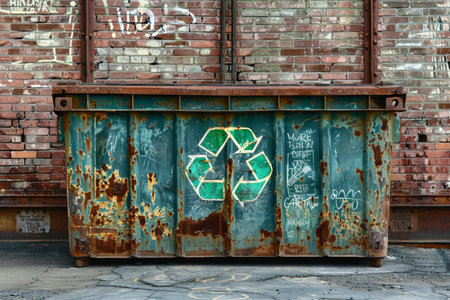 Weathered metal trash bin with green recycling symbol set against a vintage brick wall background