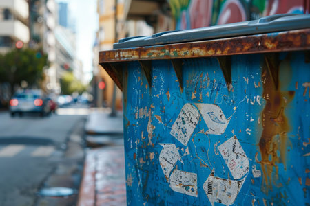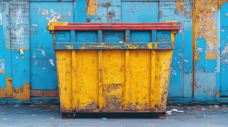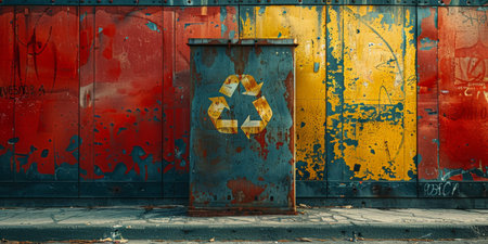 Rusty recycling bin with a grunge wall background, symbolizing urban environmental awareness. With Generative AI technology.