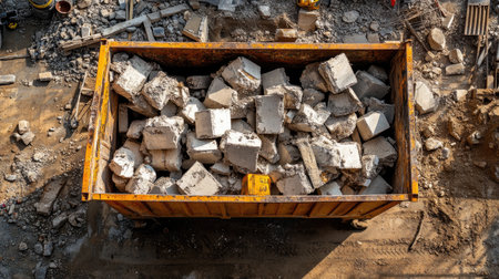 A large waste container sits at a busy construction site, filled to the brim with broken concrete blocks and construction debris awaiting disposal.