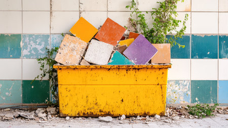 A vibrant yellow dumpster overflowing with an array of colorful broken tiles is set against a backdrop of faded wall tiles and creeping vegetation, capturing urban decay's beauty.