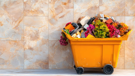 A vibrant yellow waste management cart filled with discarded materials and colorful flowers sits against a textured wall, illustrating urban disposal challenges.