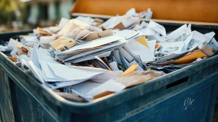A blue recycling bin overflowing with discarded papers and documents creates a scene of clutter and waste in an urban environment, highlighting disposal issues.