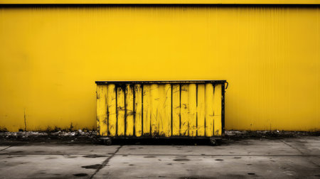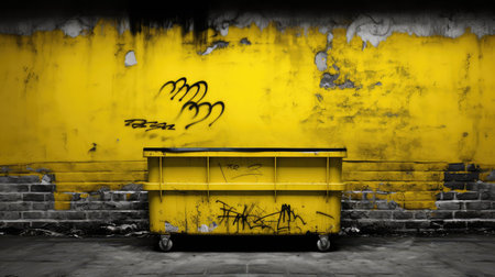 A vibrant yellow dumpster brimming with a variety of colorful scrap materials, set against a sleek gray wall, emphasizing urban waste management practices.