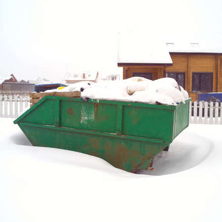 Construction area with a garbage container covered with snow