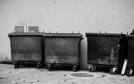 Large garbage containers, trash dumpsters standing in row at wall