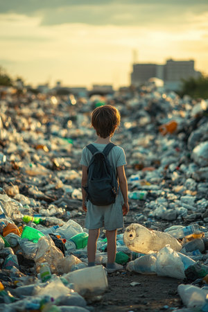 A young child gazes thoughtfully from a mound of waste, reflecting the harsh realities of poverty and environment. A powerful image showcasing social challenges.