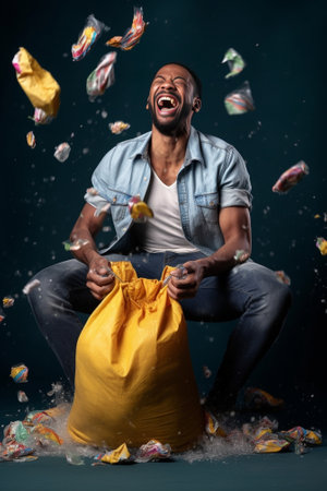 Cheerful dark skinned man with thick beard sticks head through popcorn background enjoys eating tasty snack has toothy smile expresses positive emotions Black man buried : Generative AI
