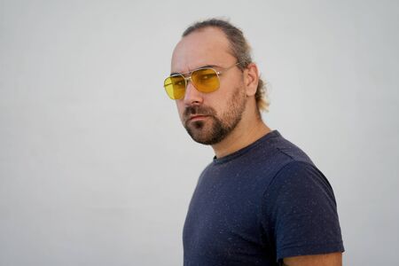 Handsome young unshaven man blue shirt yellow sunglasses stands near white walls summer day. Bearded hipster standing outdoor. Fashionable young adult caucasian guy modern urban clothes with tattoo