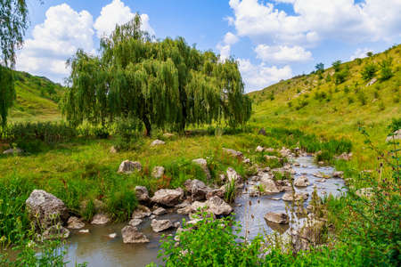 Mountain river or stream with stones in the canyon valley. Nature background with copy space for text or lettering.