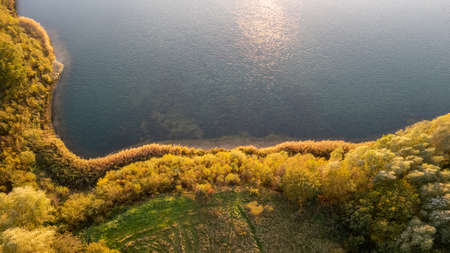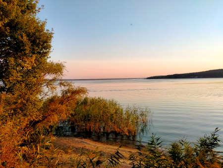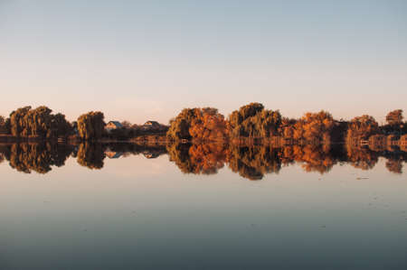 Orange sunset against the background of the river in September in the harvest season. Reflection in the water from the trees. Beautiful autumn landscape. Autumn colors are reflected in calm waters.