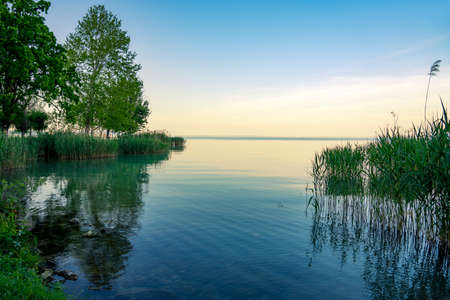 Nature and reed reflection on the Lake Balaton in Hungary at sunset in Thany