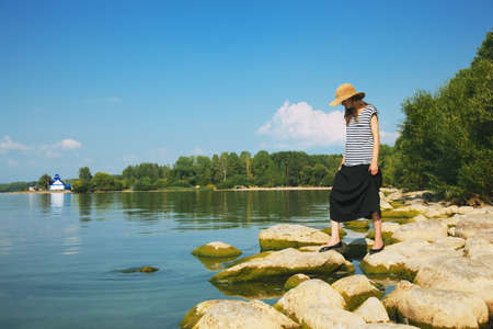 stylish woman walking along stone sea coast