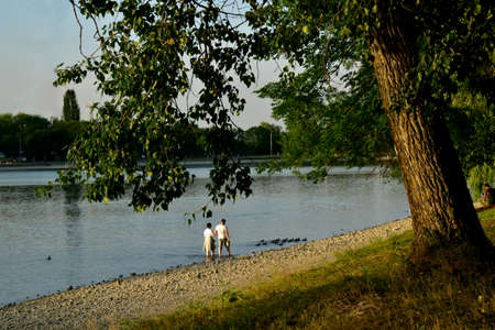 View of the city lake. A man and a woman walk along the shore for a group of wild ducks.