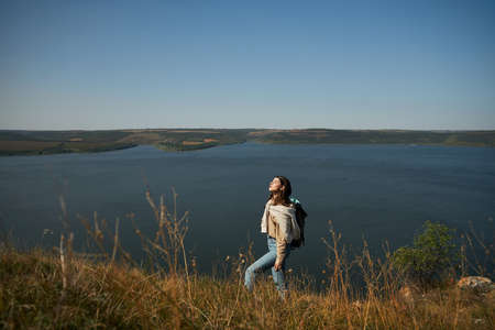 Attractive young lady in casual wear hiking with backpack among beautiful nature near Dniester river. Scenic landscape on background.