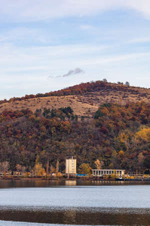 View of Danube river and Orsova city vegetation and buildings, waterfront view. Orsova, Romania, 2021