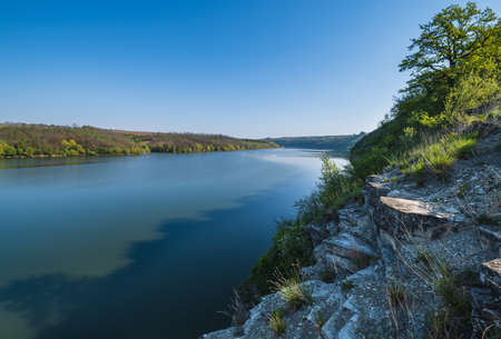 Amazing spring view on the Dnister River Canyon with picturesque rocks, fields, flowers. This place named Shyshkovi Gorby, Nahoriany, Chernivtsi region, Ukraine.