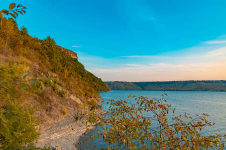 View of Bakota Bay with rocky cliffs by Dniester river. National Park Podilski Tovtry. Ukraine