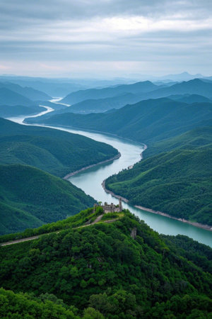 Aerial view on the Danube river and mountains in Djerdap National Park, Serbia Romania border