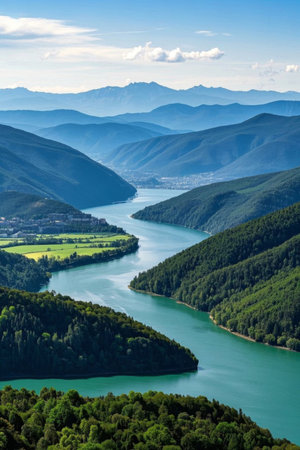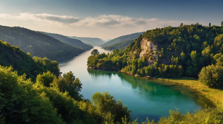 Beautiful landscape of the Danube river flowing through the mountains in Romania