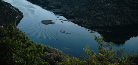 A small boat creates ripples on a calm river winding through forested mountains in Montenegro. Captured from above at twilight, the scene radiates peace and natural beauty. Rijeka Crnojevica