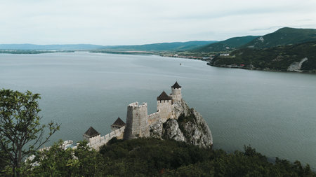 Aerial view of Golubac Fortress on rocky cliff above the Danube River in Serbia, surrounded by water and medieval towers. The most popular and beautiful fortress in Serbia on the border with Romania