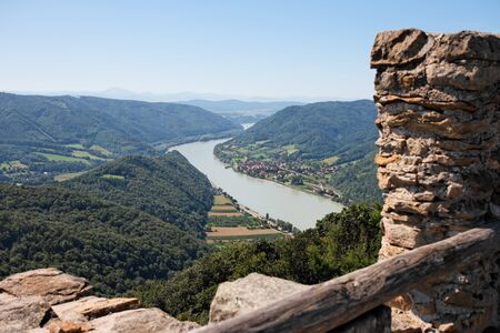 View of Danube valley from ruins of medieval Aggstein castle in Austria