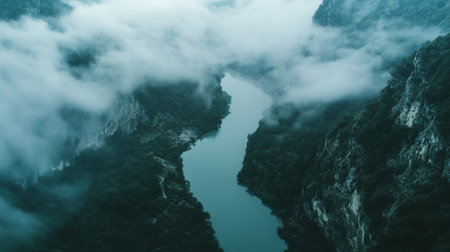 Clouds envelop the serene river as it means through rugged mountains. Lush greenery contrasts with the mist, creating a tranquil atmosphere in the early morning light.